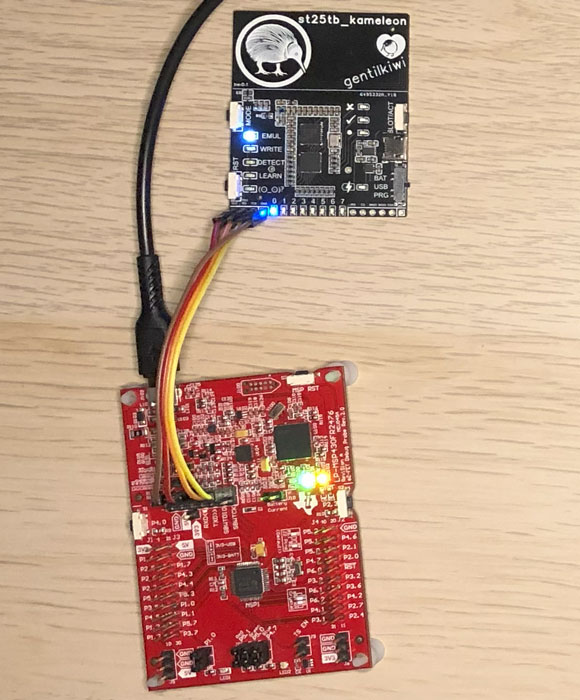 > MSP430Flasher -i TIUSB -n MSP430FR2673 -z [VCC,RESET] -e ERASE_ALL -v -w st25tb_kameleon.hex
