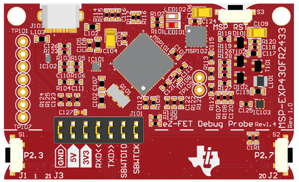 eZ-FET 1.x,eZ-FET 2.xoreZ-FET Lite(orez430for oldest ones) emulator (https://www.ti.com/lit/pdf/slau647) at the top of the board.