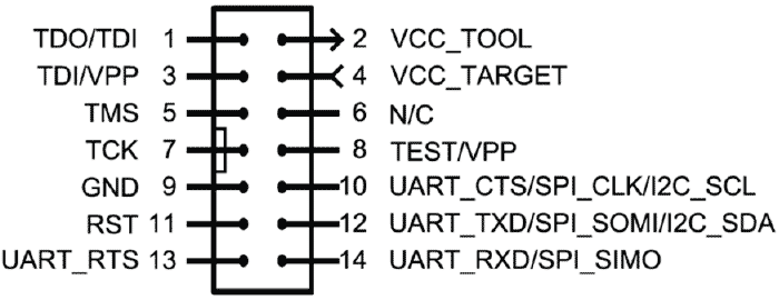 To debug/program, Spy-Bi-Wire JTAG is generally used, a 2-wire alternative transport for JTAG, multiplexing JTAG signals onto TEST and RESET pins, with a specific entry sequence.