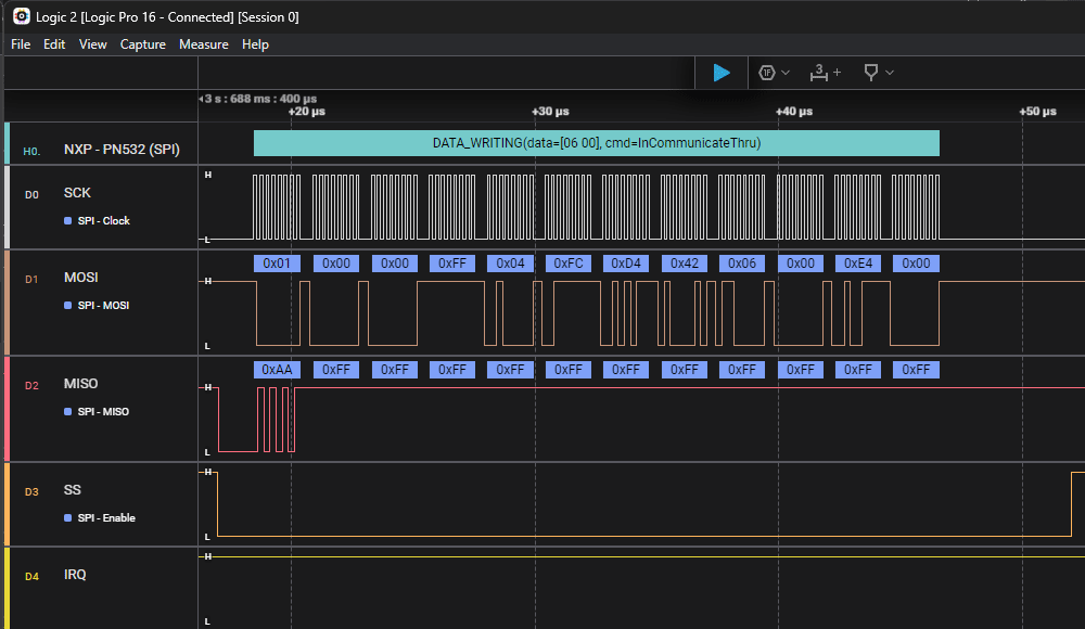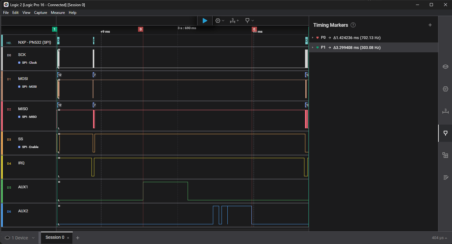 The NFC exchange is ~1.4 ms (P0), but the whole communication part is ~3.3 ms (P1).